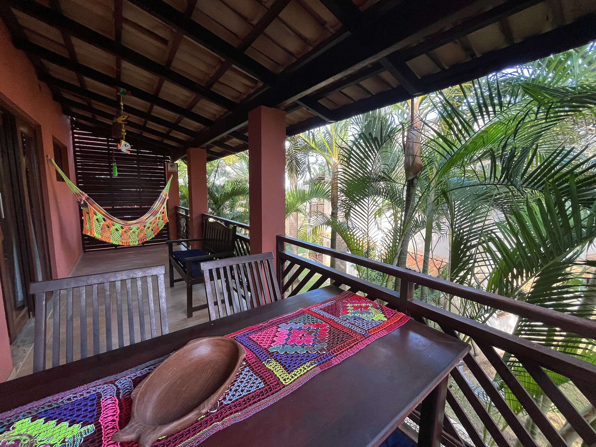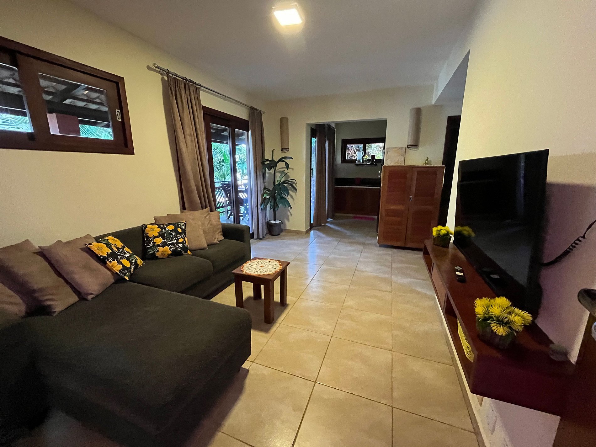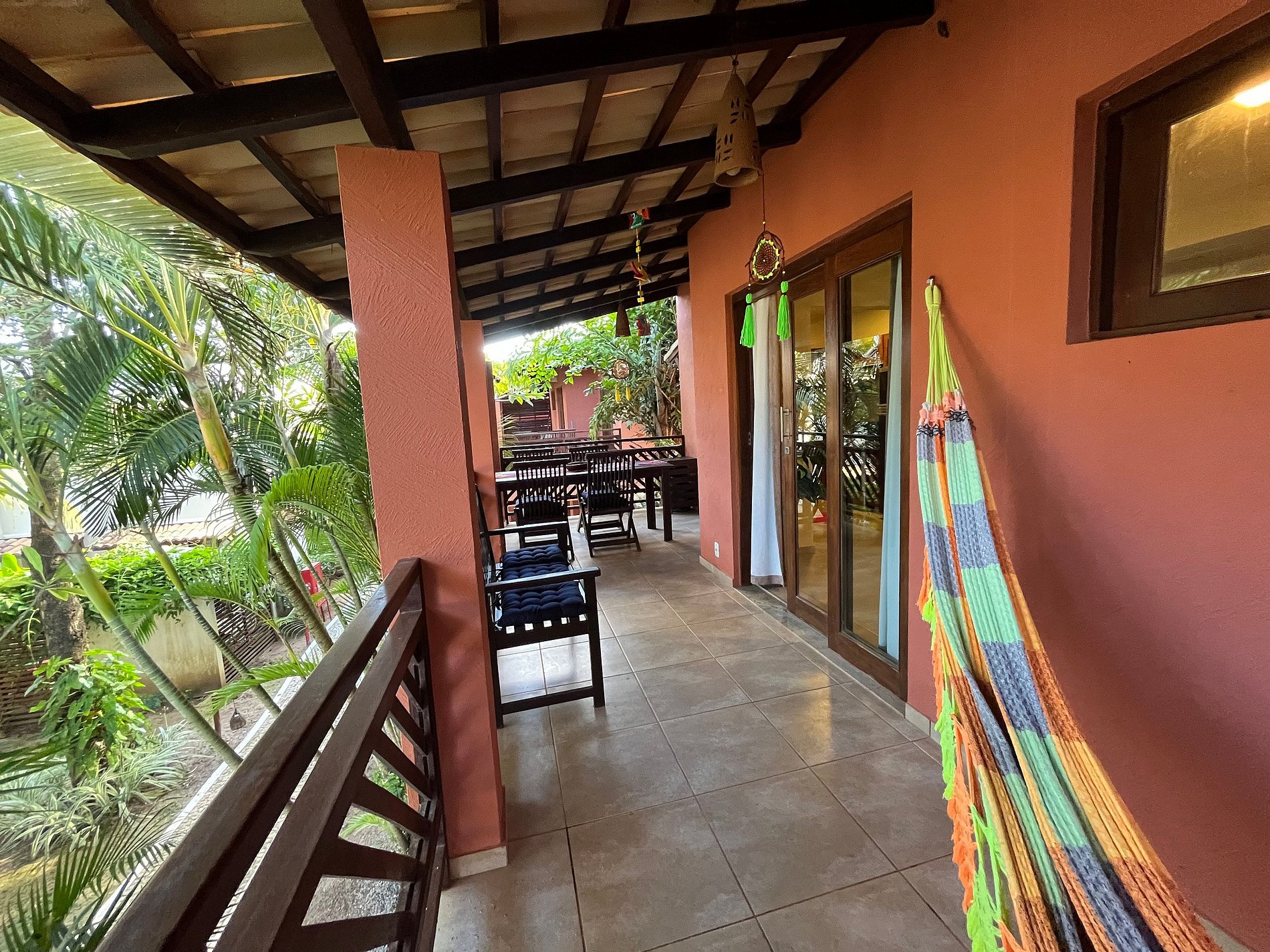 Possui 2 quartos e 1 banheiro, sala com TV, cozinha compacta, varanda com mesa de refeições, rede de descanso e acesso ao solário na cobertura, com banheira de hidromassagem, rodeado pela natureza e vista pro mar.