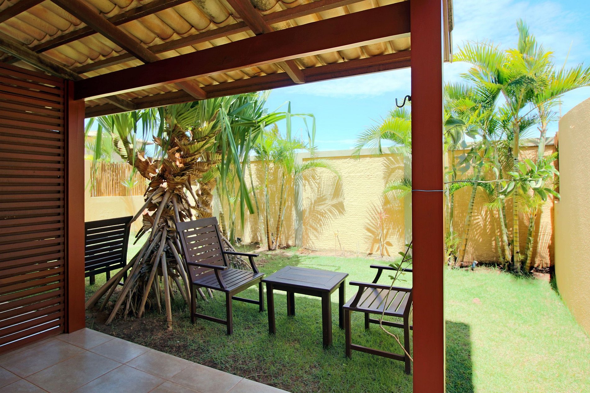 Suíte compacta, instalada no piso térreo da Villa Triplex. Inclui 1 cama de casal, TV tela plana, ar- condicionado, banheiro com chuveiro, e uma varanda com rede.