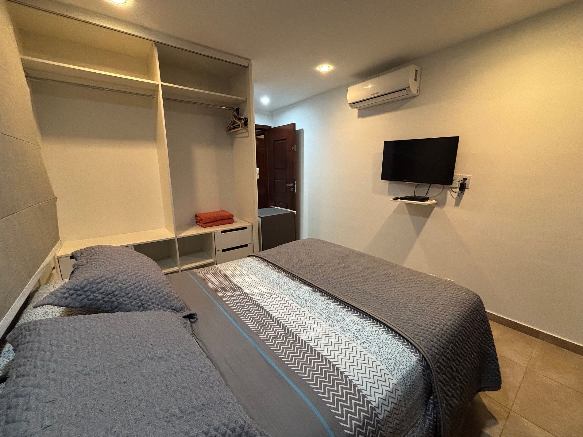 Suíte compacta, instalada no piso térreo da Villa Triplex. Inclui 1 cama de casal, TV tela plana, ar- condicionado, banheiro com chuveiro, e uma varanda com rede.