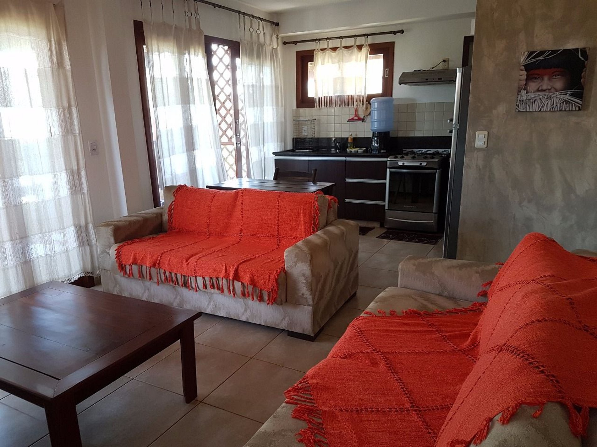 Aconchegante unidade particular instalada no primeiro piso de uma casa triplex, incluindo 1 quarto com cama de casal e ar-condicionado, 1 banheiro com chuveiro, 1 sala de estar com TV integrada à cozinha compacta e varanda com mesa para refeições, e acesso ao solarium externo com jacuzzy privativa e vista pro mar.