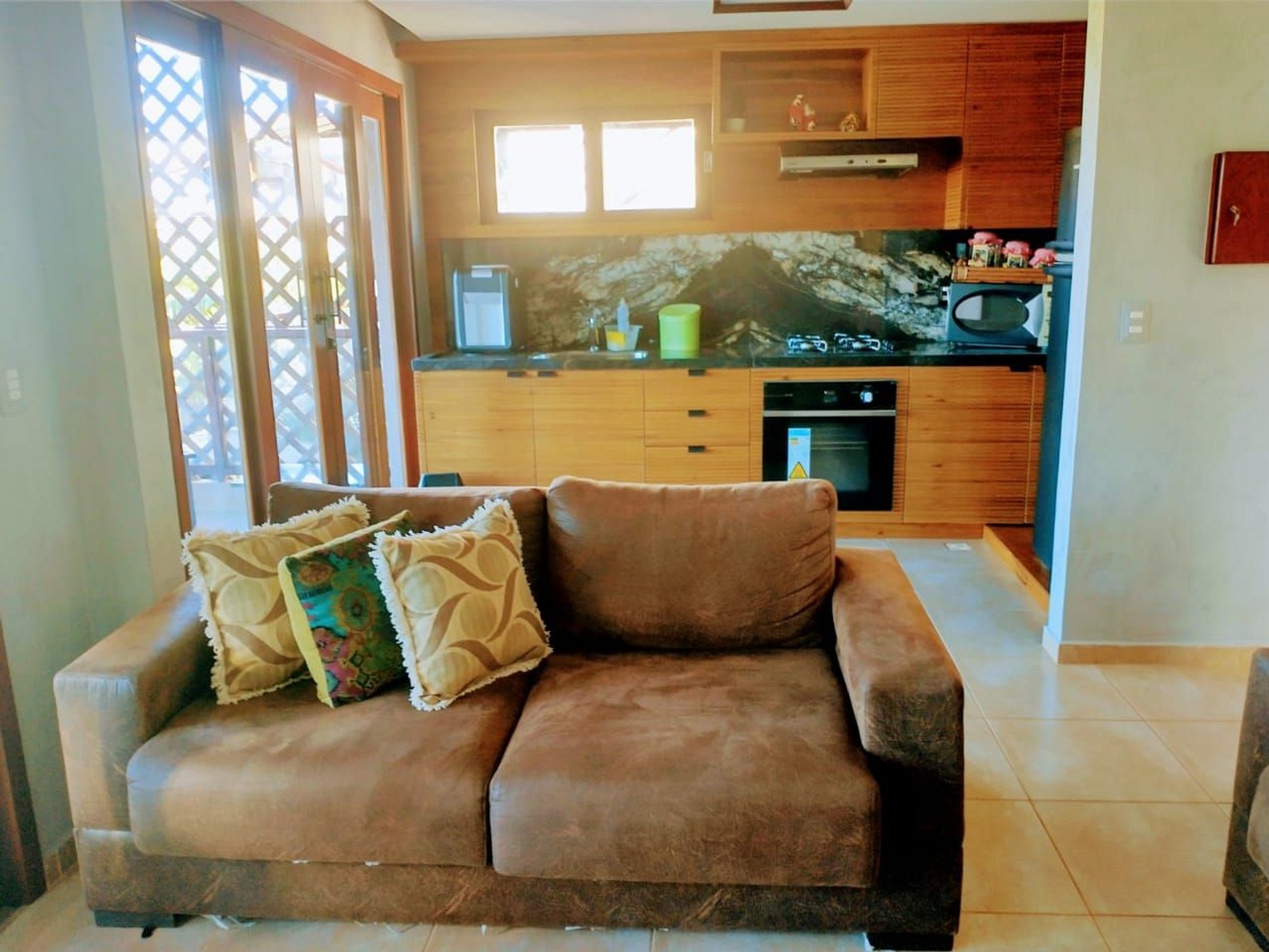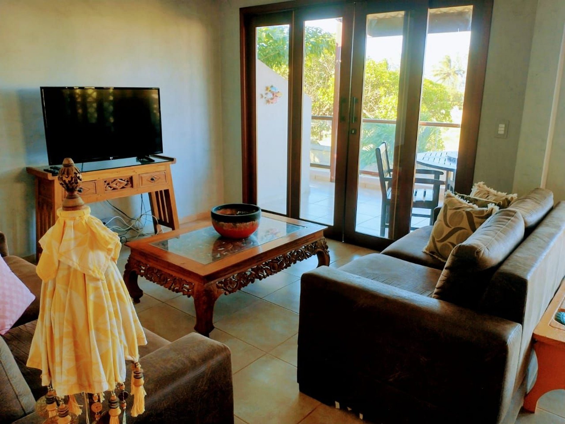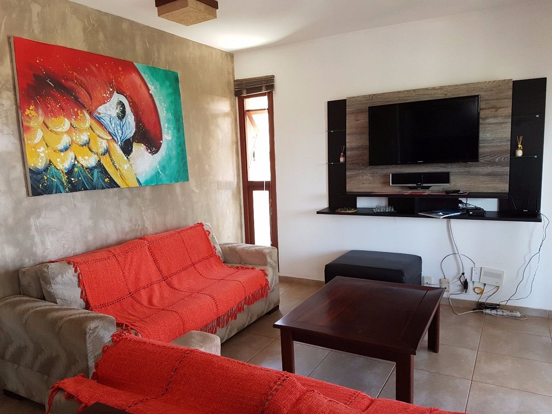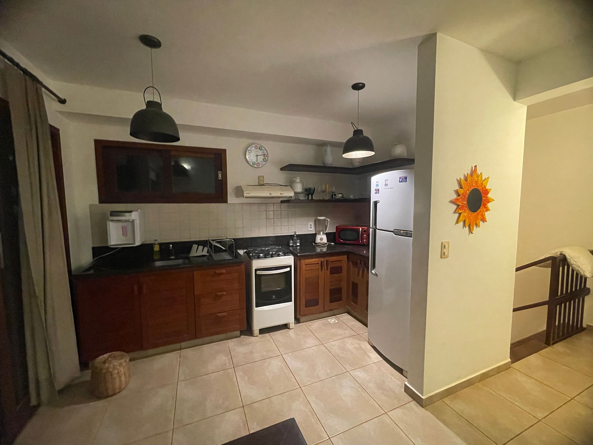 Aconchegante unidade particular instalada no primeiro piso de uma casa triplex, incluindo 1 quarto com cama de casal e ar-condicionado, 1 banheiro com chuveiro, 1 sala de estar com TV integrada à cozinha compacta e varanda com mesa para refeições, e acesso ao solarium externo com jacuzzy privativa e vista pro mar.