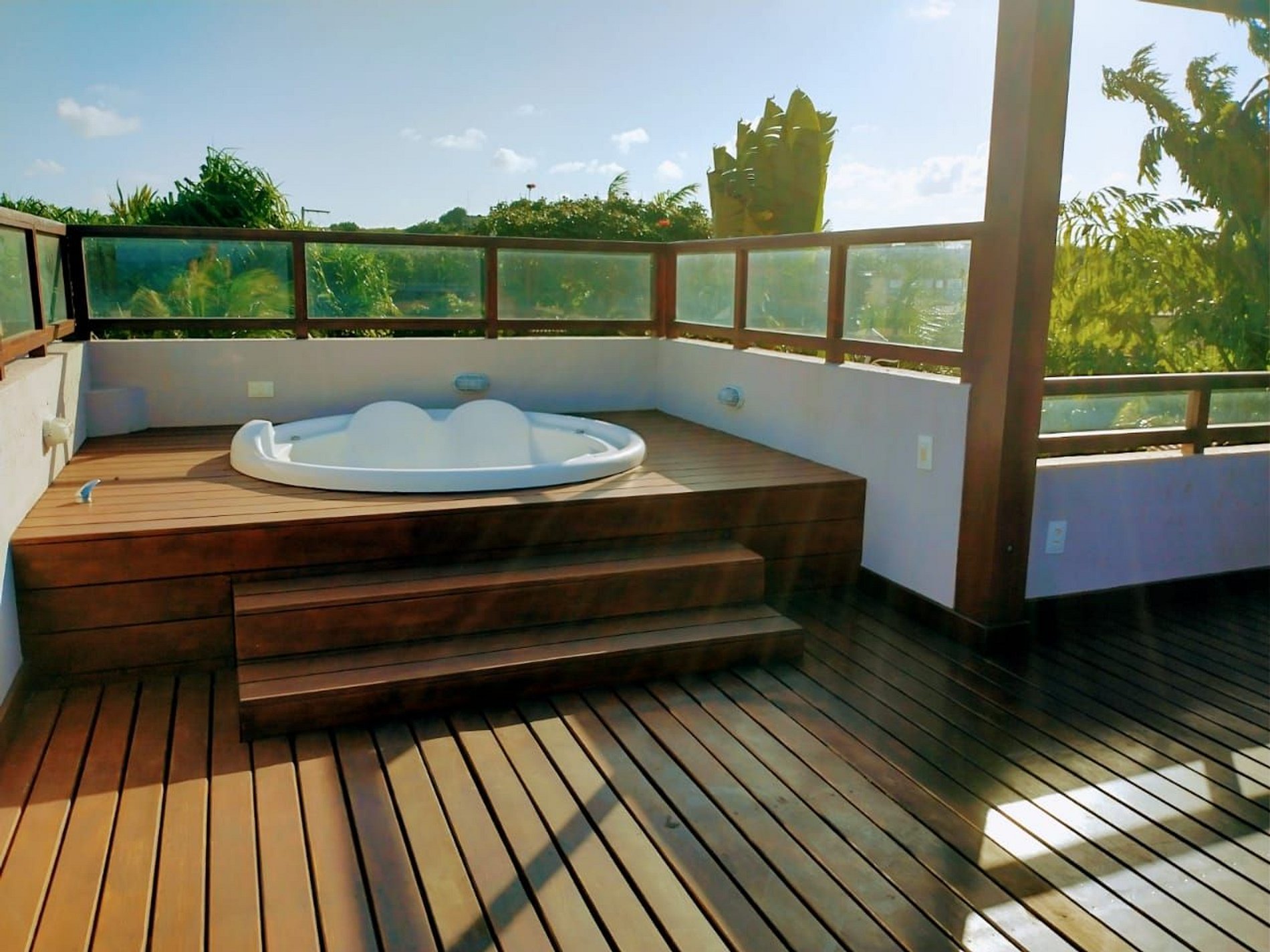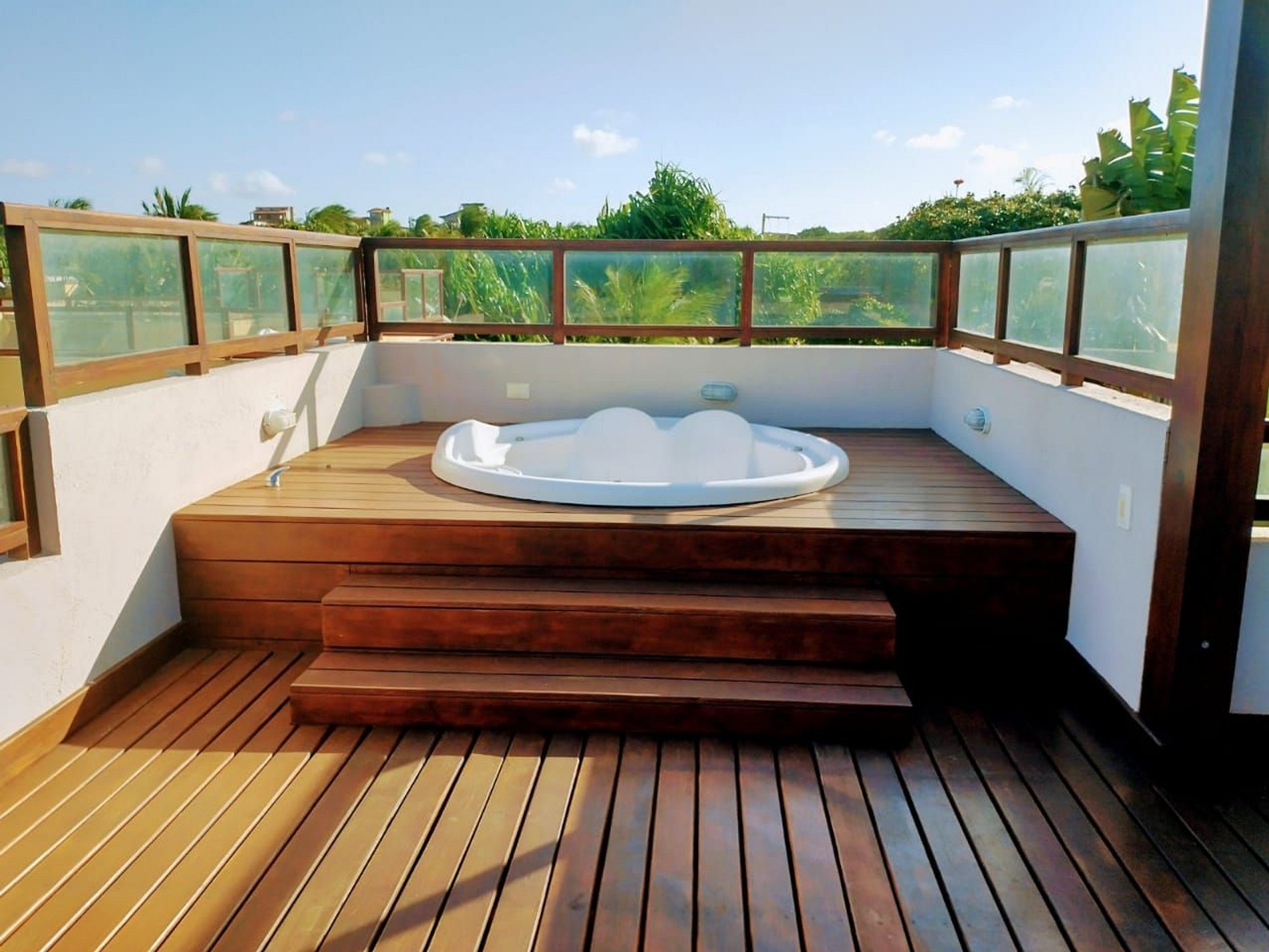 Esse apartamento é uma excelente opção para casal que gosta de conforto, por estar instalado no piso superior, e ser completo com sala, cozinha e uma varanda muito agradável. Além disso, possui um solário aberto, na cobertura, com banheira de hidromassagem e uma vista maravilhosa!